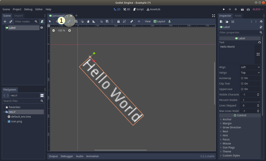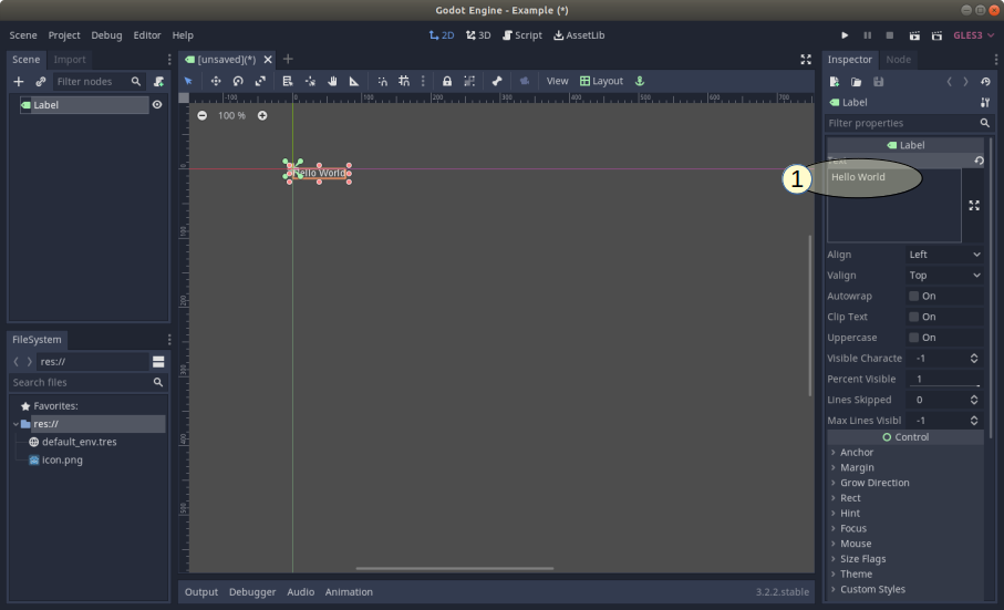 이제, 'Hello World' label 노드 를 2D 씬 에 추가해 보자.