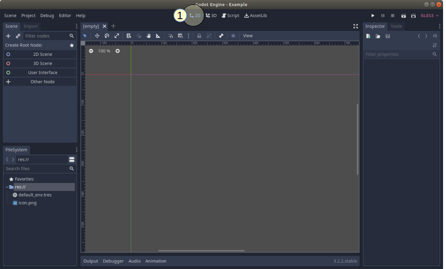 자 일단, 2D 씬 에디터 뷰로 바꿔보자. 상단의 2D 버튼을 를 누르거나 'F1' 단축키를 누르면 된다.
