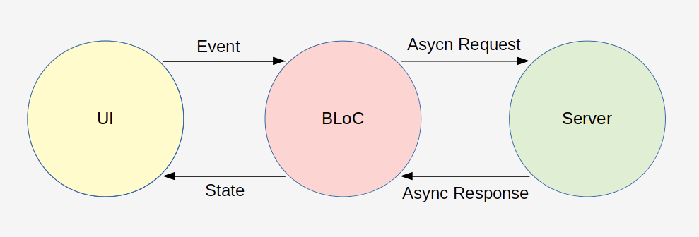 BLoC 은 Business Logic Component 의 약자로서 로직과 UI 코드를 분리 (decoupling) 하는 패턴이다. 비즈니스 로직과 UI 코드를 분리하여 모듈화 함으로서 관리 및 유지보수가 용이해 지는 장점이 있다. 아래 그림에서 UI 는 플러터 위젯을 사용해서 그림을 그리는 부분을 의미하고, BloC 는 서버로 부터 데이터를 가져와서 처리하는 부분이다. 기본적인 동작은 1) UI가 BLoC에 이벤트를 전달하여 BLoC이 서버로 부터 데이터를 수신하게 하고 2) BLoC은 서버 데이터 수신 후 변경된 State를 UI에 전달하여 UI 가 갱신되게 한다.