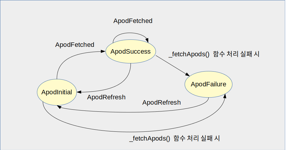 - 서버로 부터 데이터를 받고 처리하는 _fetchApods 실패 시 ApodFailure 상태로 전이