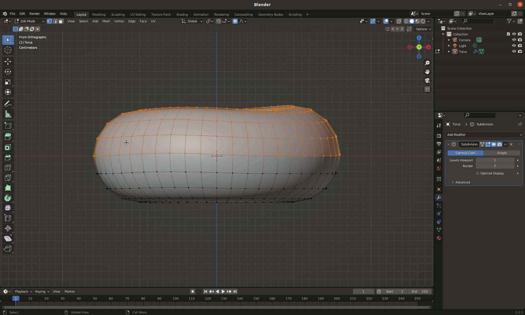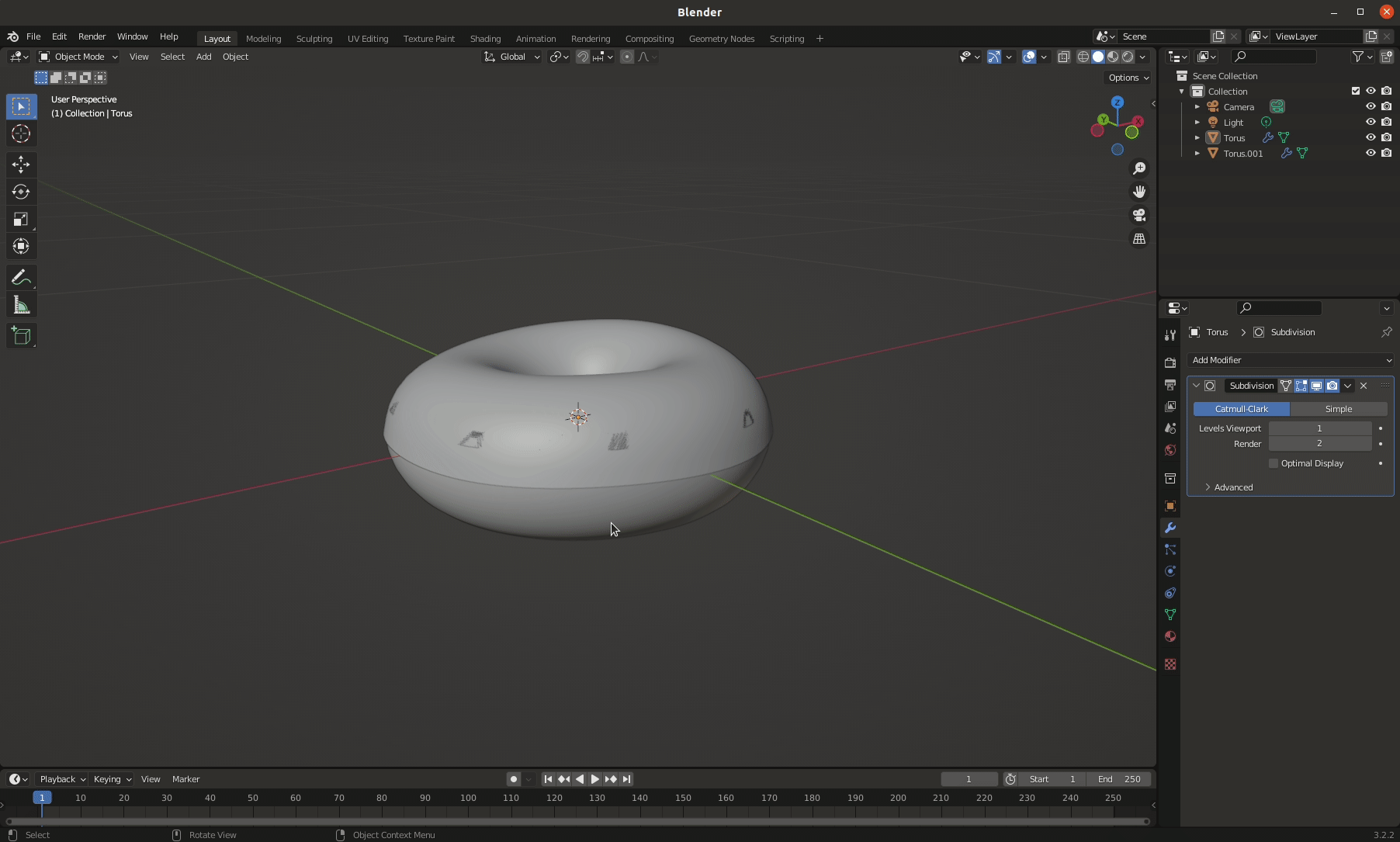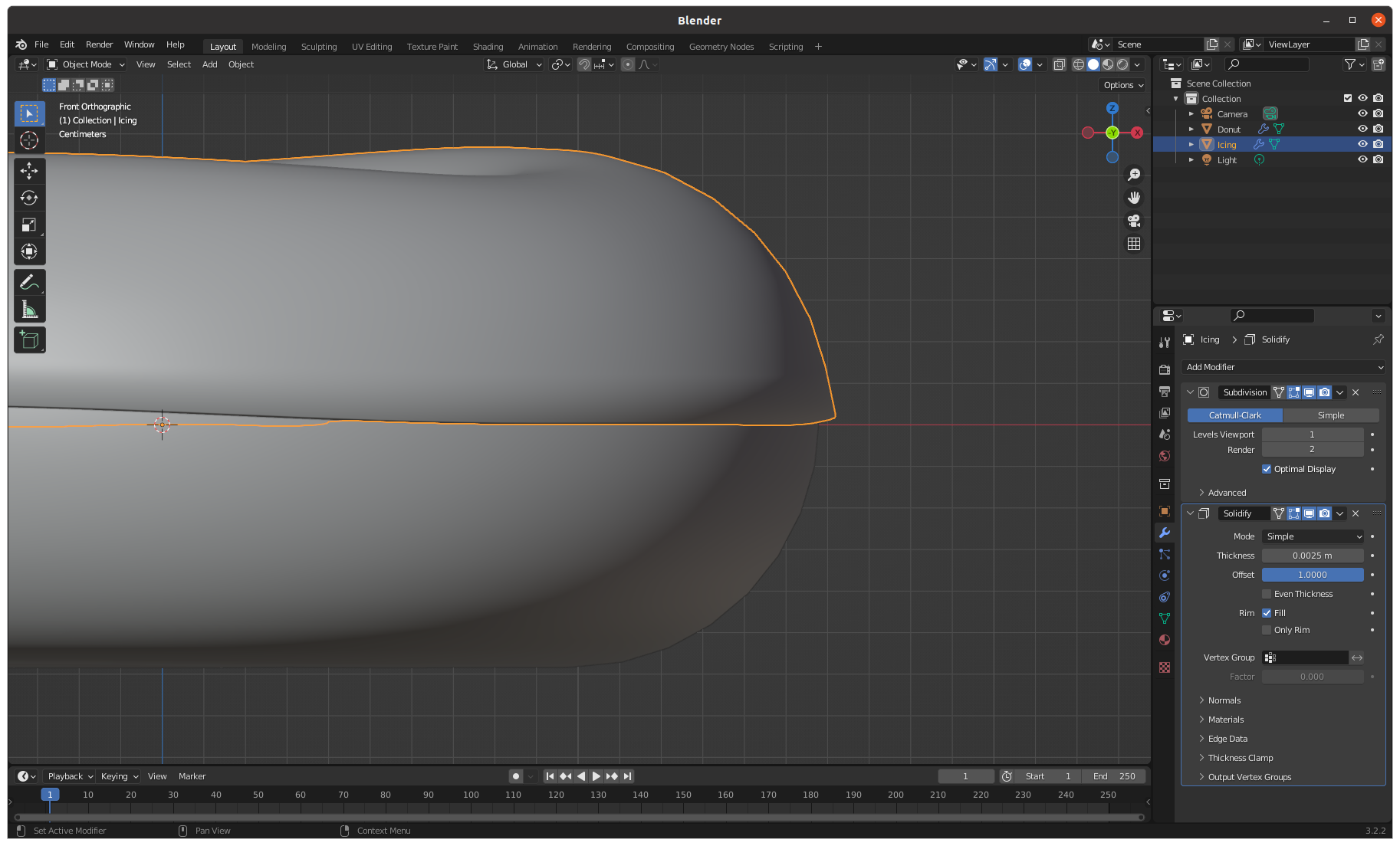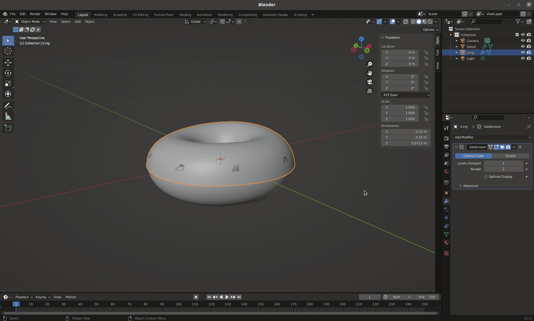 이전 튜토리얼에서 배웠던 것처럼 subdivision modifier를 사용하면 부드러워 진다. 하지만! 아이싱에 이미 도넛에 적용했던 subdivision modifier가 추가되어 있는데도 각져있는 것은 왜일까??