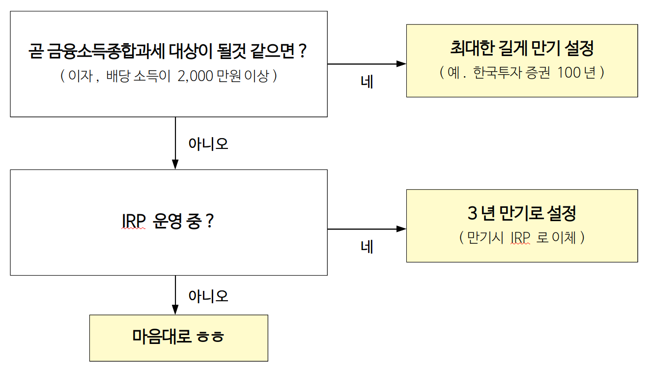 - 조만간 금융소득종합과세 대상이 될것 같은 부자라면 최대한 길게 만기를 설정하자. 금융소득종합과세 대상이 되면 ISA 만기 연장 및 신규 생성이 불가능하다.